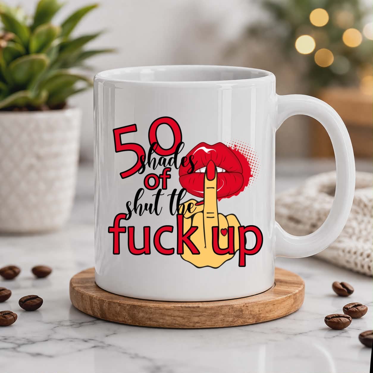 11oz Sublimated Ceramic Coffee Mug – “50 Shades of Shut the F*ck Up” Design