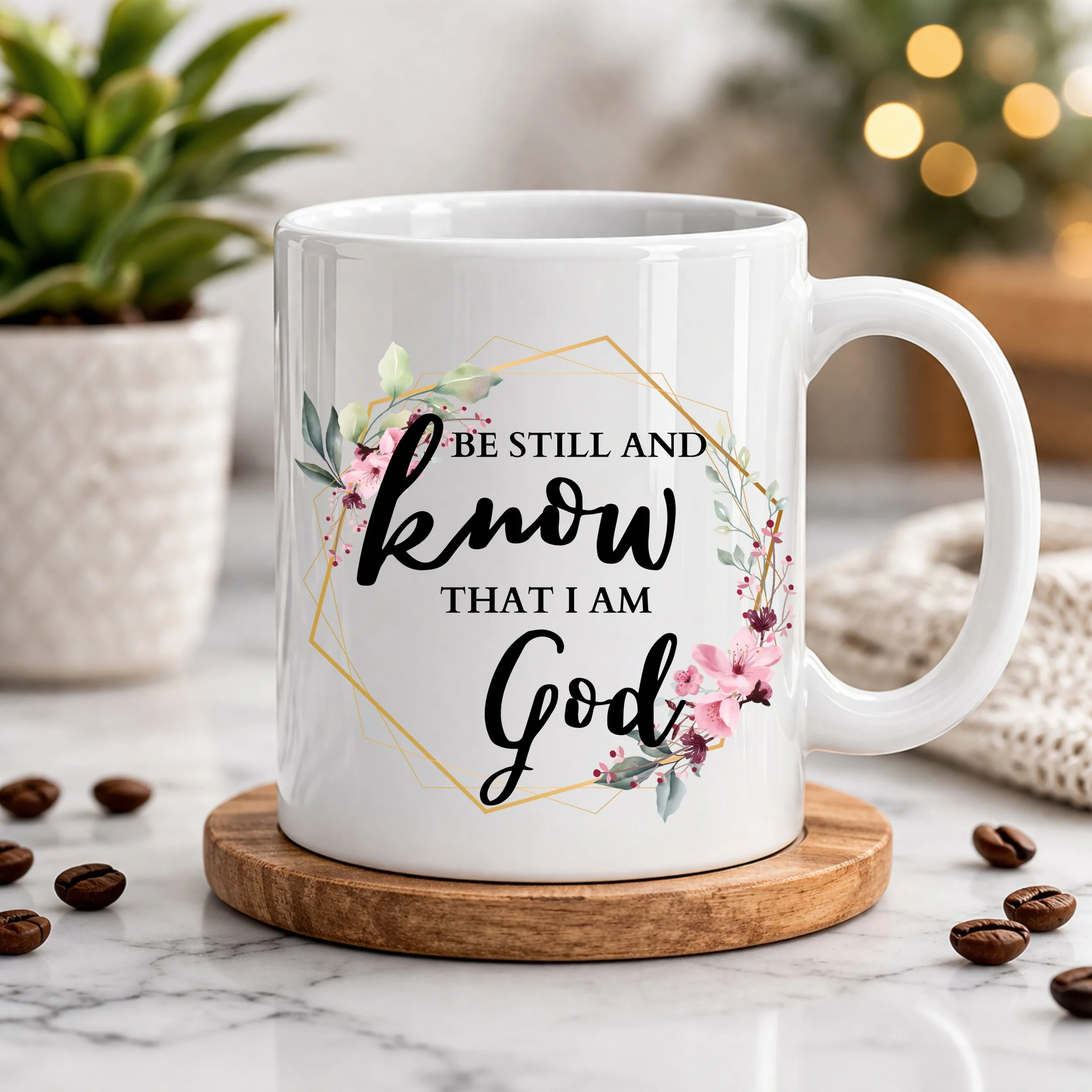 Bring a sense of peace and inspiration to your daily routine with this beautifully designed 11oz ceramic coffee mug. Featuring the timeless phrase “Be Still and Know That I Am God”, this elegant design is complemented by soft floral accents and delicate geometric detailing—creating a calming, meaningful piece perfect for quiet moments and reflection.