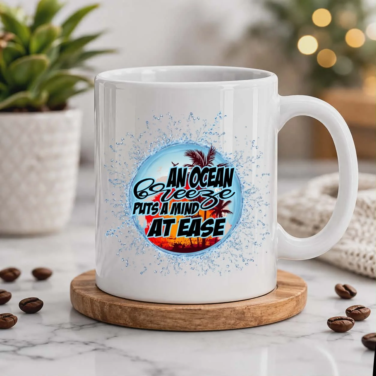 Escape into tranquility with our beautifully designed “An Ocean Breeze Puts A Mind At Ease” 11oz Ceramic Mug. Featuring a calming coastal scene with soft ocean tones, palm silhouettes, and a refreshing splash effect, this mug captures the peaceful essence of seaside living—perfect for grounding your mornings or unwinding at the end of the day.