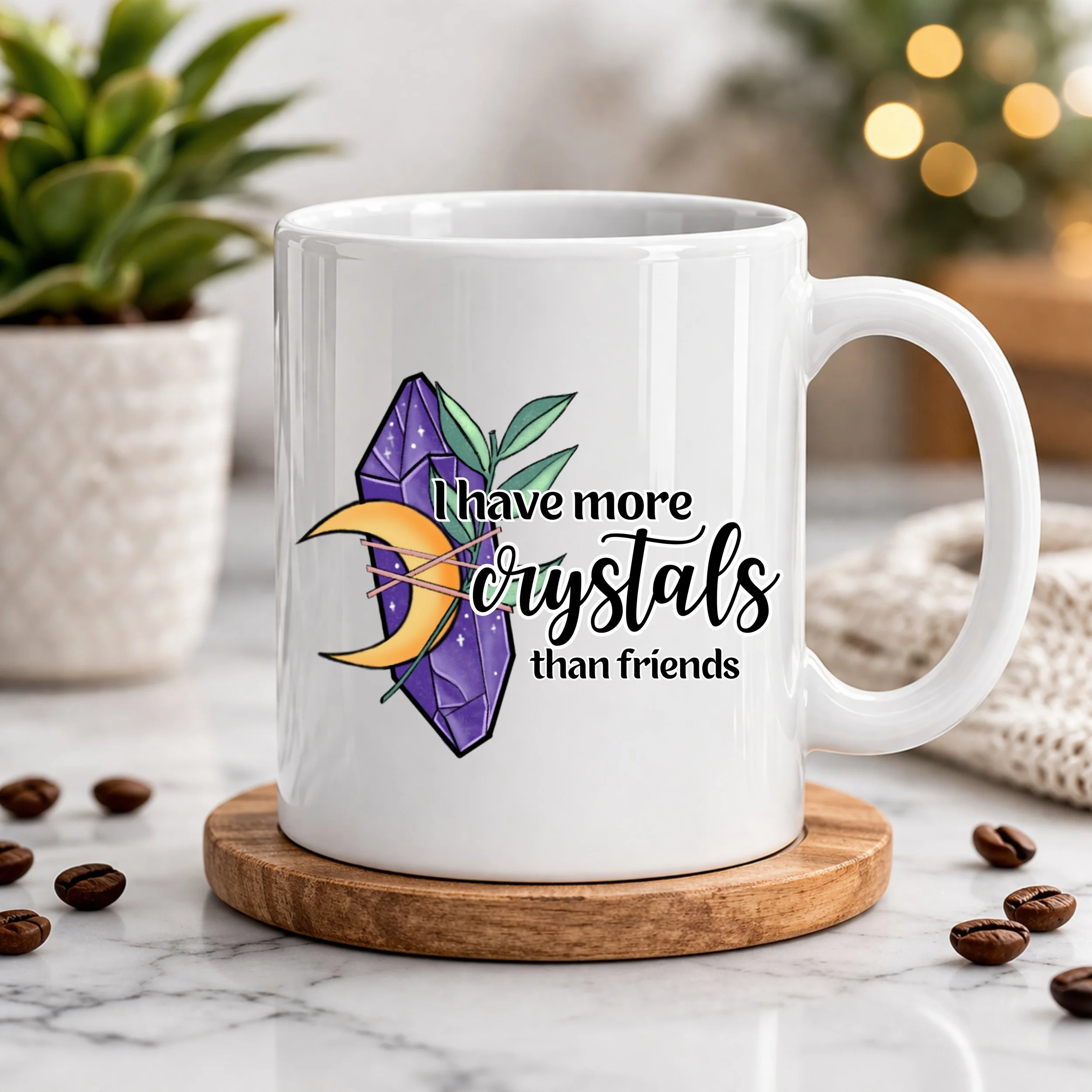 Add a touch of personality and mystical charm to your daily routine with this eye-catching 11oz ceramic coffee mug. Featuring a bold and playful quote, “I have more crystals than friends,” paired with vibrant crystal artwork and celestial accents, this design is perfect for those who embrace their unique energy and love a little magic in their everyday life.