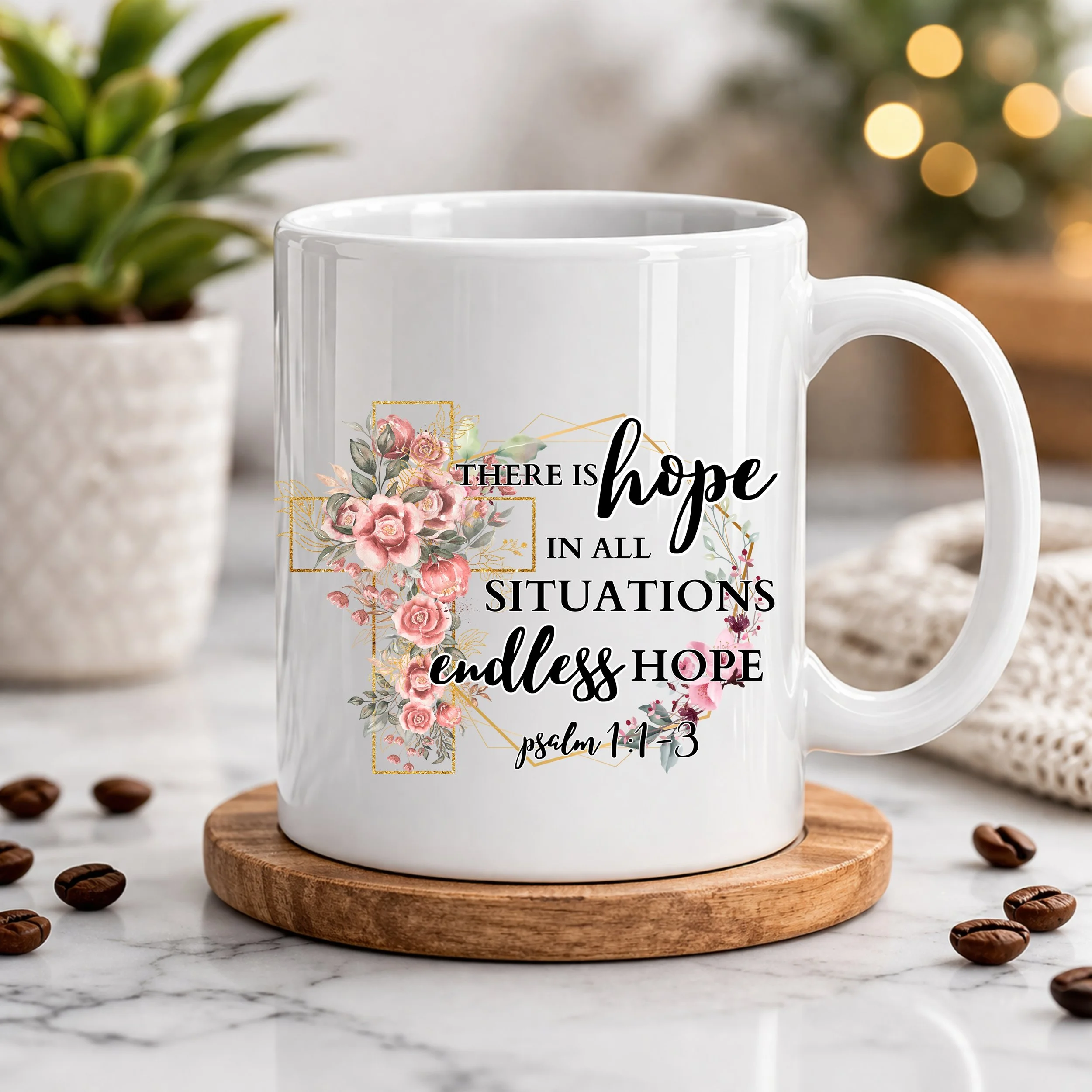 Wrap your day in faith and encouragement with this beautifully designed “There Is Hope in All Situations – Endless Hope” ceramic mug, inspired by Psalm 147:3. Featuring a delicate floral cross and soft, elegant accents, this meaningful design serves as a gentle reminder that hope is always present—no matter the season.