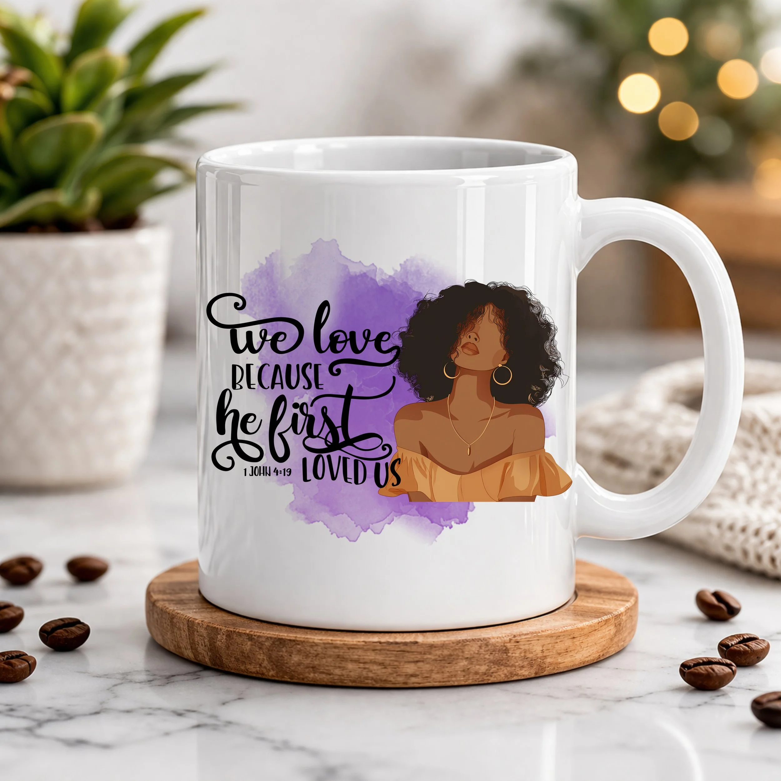 Start your day grounded in faith and beauty with this elegant 11oz ceramic mug, featuring the powerful message “We love because He first loved us – 1 John 4:19.” Paired with a soft watercolor backdrop and a graceful, feminine illustration, this design brings together inspiration, strength, and modern style.