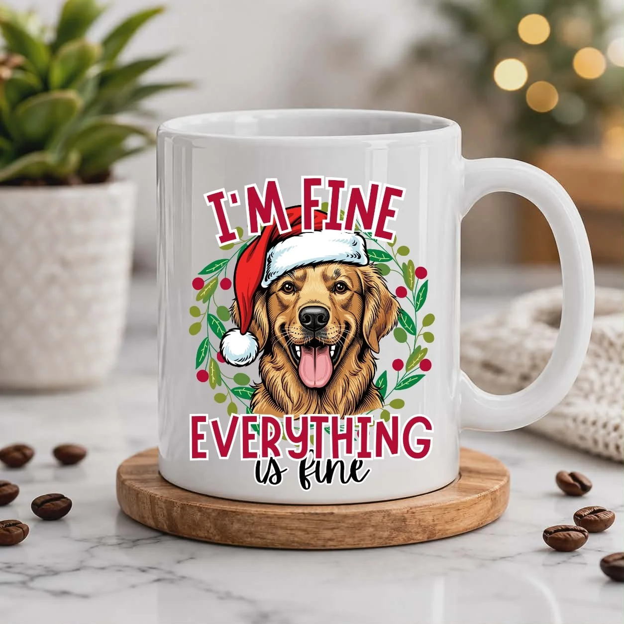 Bring a little humor to the holiday hustle with this fun and relatable 11oz ceramic mug. Featuring an adorable festive pup in a Santa hat paired with a cheeky “I’m Fine, Everything Is Fine” message, this design perfectly captures the chaos and charm of the season—with a smile.