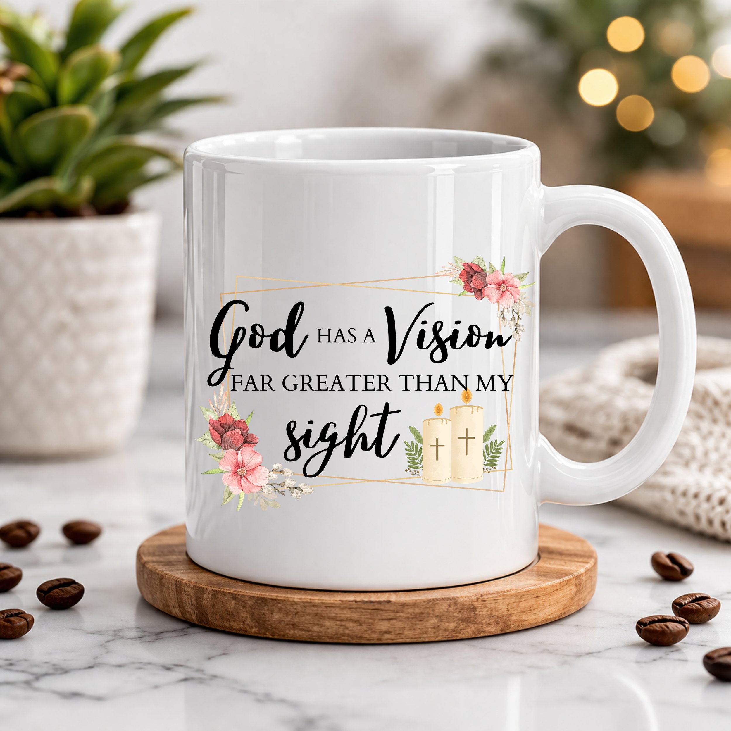 Embrace faith and trust in every moment with this beautifully designed 11oz ceramic coffee mug. Featuring the inspiring message “God has a vision far greater than my sight”, this piece combines elegant script lettering with soft floral accents, subtle gold detailing, and delicate candle imagery—creating a meaningful design that brings comfort and encouragement to your daily routine.