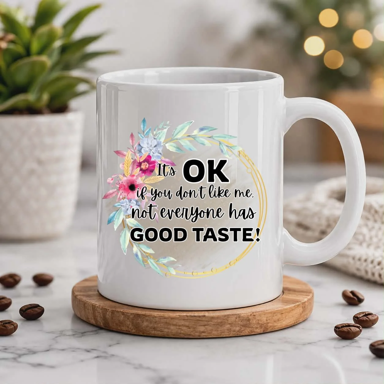Sip in style with a touch of confidence and charm using this beautifully designed “It’s OK If You Don’t Like Me, Not Everyone Has Good Taste” ceramic mug. Featuring soft pastel florals paired with a delicate gold geometric frame, this design blends elegance with a bold, playful attitude—perfect for making a statement with every sip.