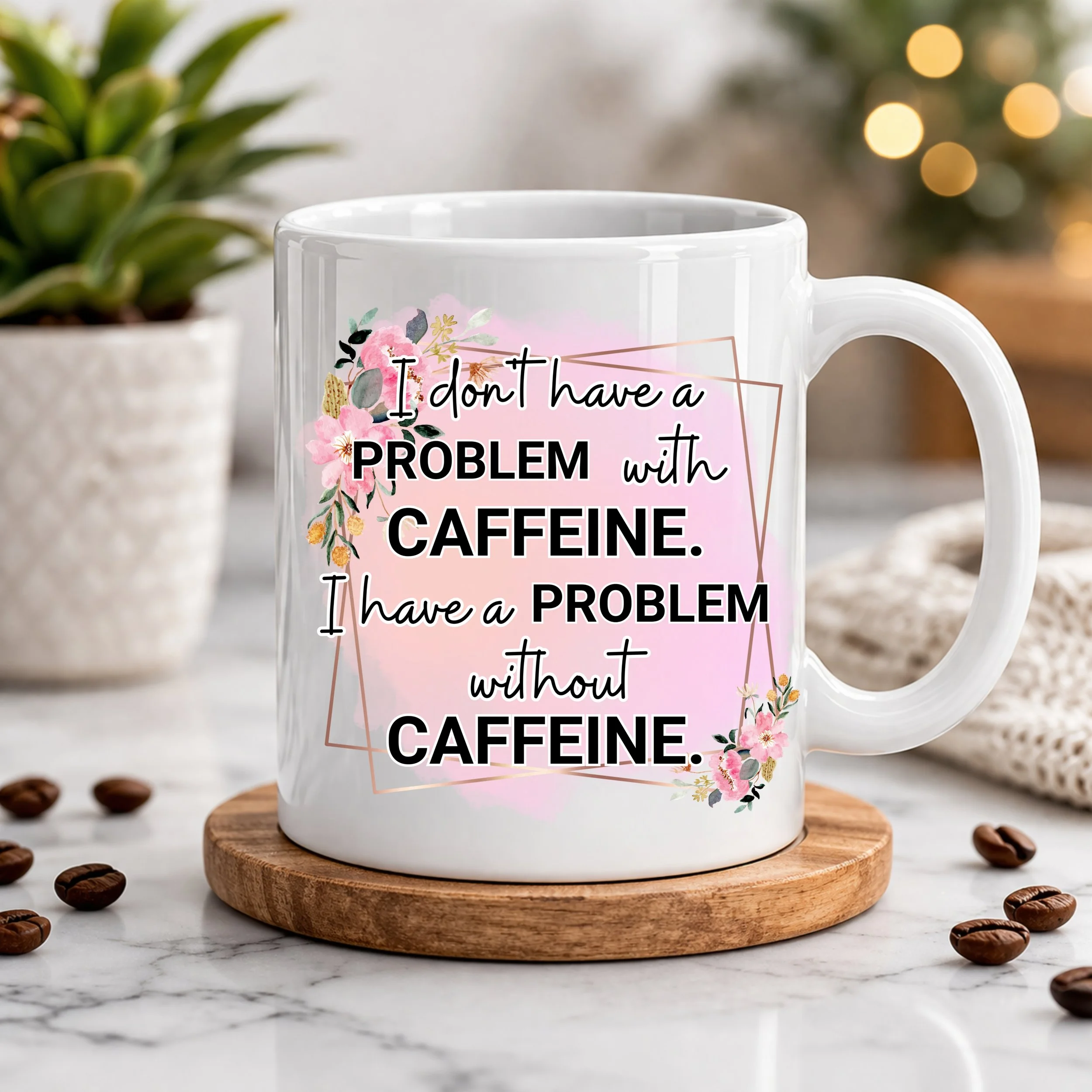 Fuel your day with humor and honesty with this chic and relatable “I Don’t Have a Problem With Caffeine… I Have a Problem Without It” ceramic mug. Designed with soft blush tones, delicate florals, and modern typography, this mug is the perfect blend of elegance and everyday sass—made for those who run on coffee and a little bit of attitude.