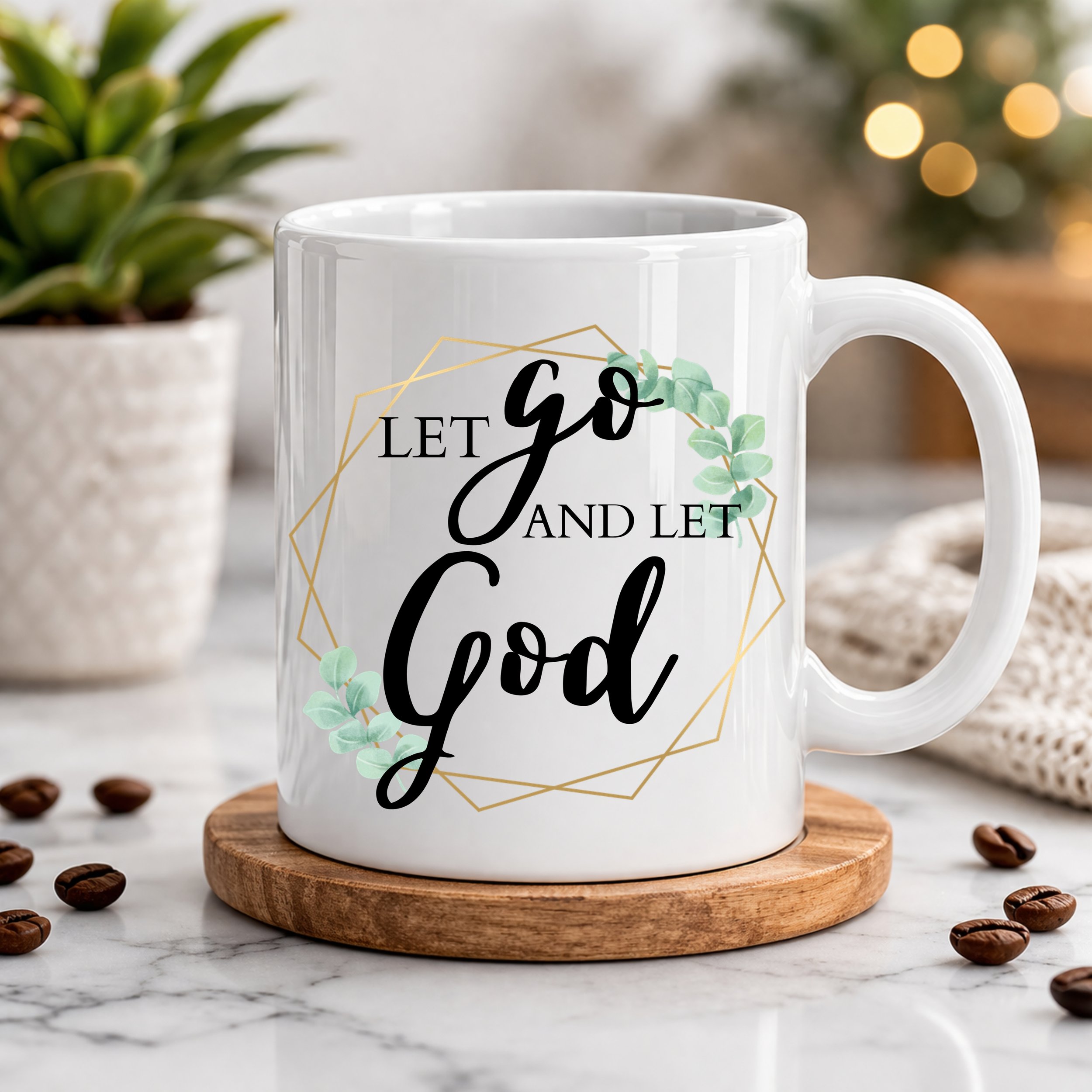 Find peace in the present moment with this elegantly designed 11oz ceramic coffee mug. Featuring the comforting phrase “Let Go and Let God”, this design pairs graceful script lettering with soft greenery and subtle geometric gold accents—creating a calming, minimalist aesthetic that brings inspiration to your everyday routine.