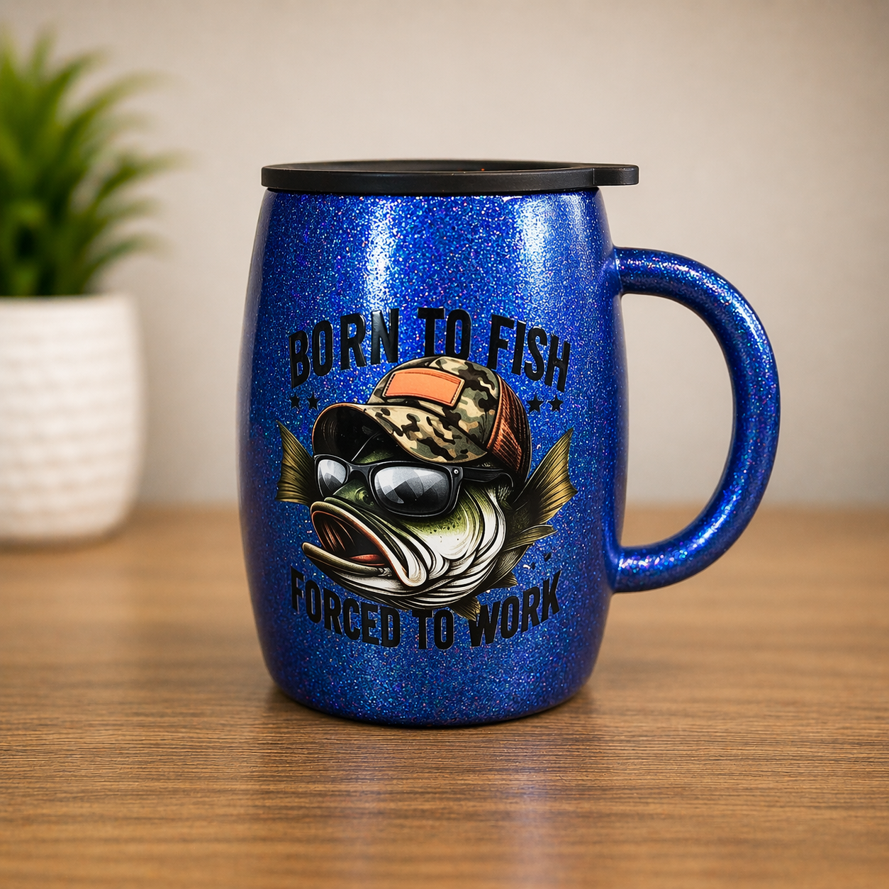 For those who’d rather be on the water than anywhere else — this “Born to Fish, Forced to Work” tumbler says it all. Featuring a bold bass graphic rocking shades and a camo hat, paired with a rich blue glitter finish, this piece brings personality, humor, and outdoorsy vibes together in one standout design.