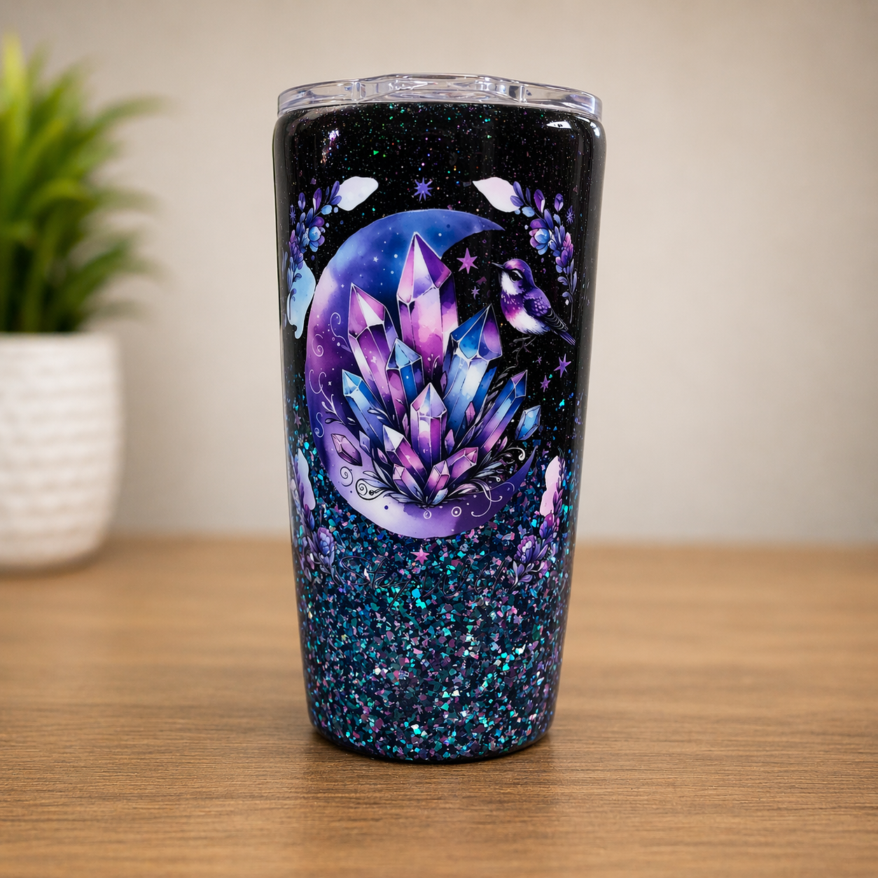 Step into a world of magic and mystery with this stunning Celestial Crystal tumbler. Featuring vibrant purple and blue crystal formations set against a dreamy moonlit sky, delicate florals, and a touch of cosmic sparkle — this design is made for those who love a little enchantment in their everyday routine.